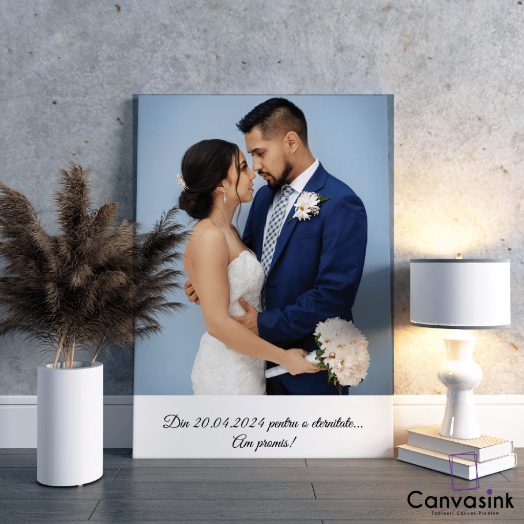 Trebuie doar să alegi dimensiunea dorită, apoi să utilizezi butonul Personalizează Tabloul. Încarcă fotografia dorită și poziționeaz-o în tablou. Pentru a modifica mesajul din exemplu, click pe acesta, șterge-l și scrie ceea ce dorești. Pentru un aspect de continuitate si eleganță, pe lateralele tabloului se vor continua milimetric marginile fotografiei încadrate.