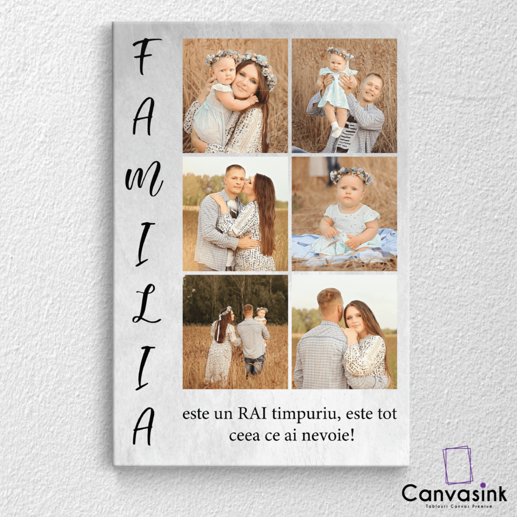 Trebuie doar să alegi dimensiunea dorită, apoi să utilizezi butonul Personalizează Tabloul. Încarcă fotografiile dorite și poziționează-le în tablou. Pentru a modifica mesajul din exemplu, click pe acesta, șterge-l și scrie ceea ce dorești.
